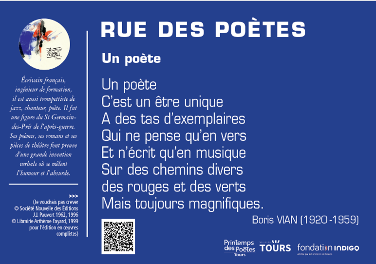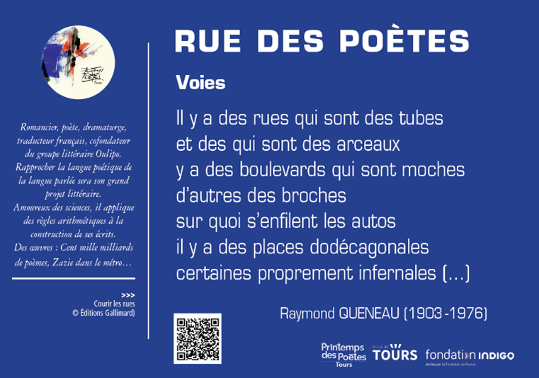 À compter du 7 mars, l’initiative « Rue des Poètes »propose un parcours pédestre de neuf étapes dans des rues tourangelles portant des noms de poètes. À chaque halte, un panneau présente un extrait de texte et quelques repères biographiques. Des QR codes à scanner permettent d’écouter les poèmes de Paul Éluard, Raymond Queneau, François Rabelais, Léopold Sédar Senghor, Paul Celan ou encore Pierre de Ronsard.