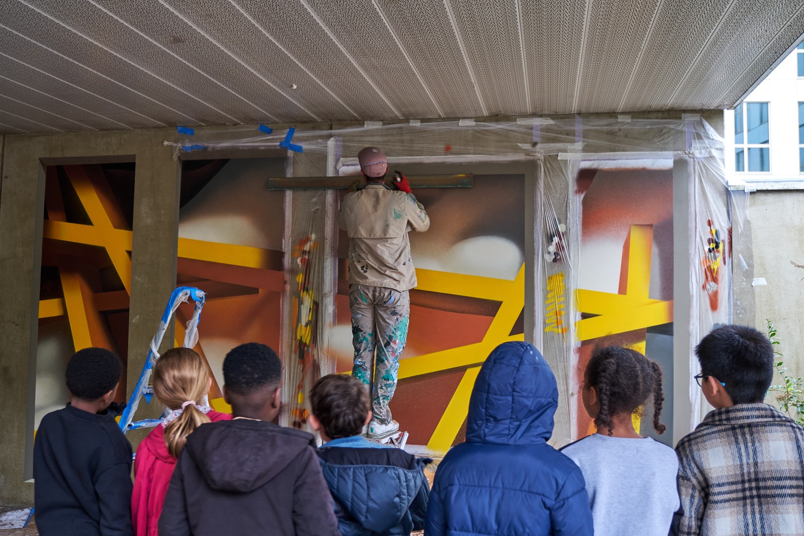 Cette fresque fait écho à un atelier créatif mené en juin 2025 avec les enfants du centre de loisirs, autour des œuvres réalisées dans les parkings. Les idées et les dessins des enfants ont nourri l’imaginaire de Shozy et l’ont aidé à créer ce décor unique.