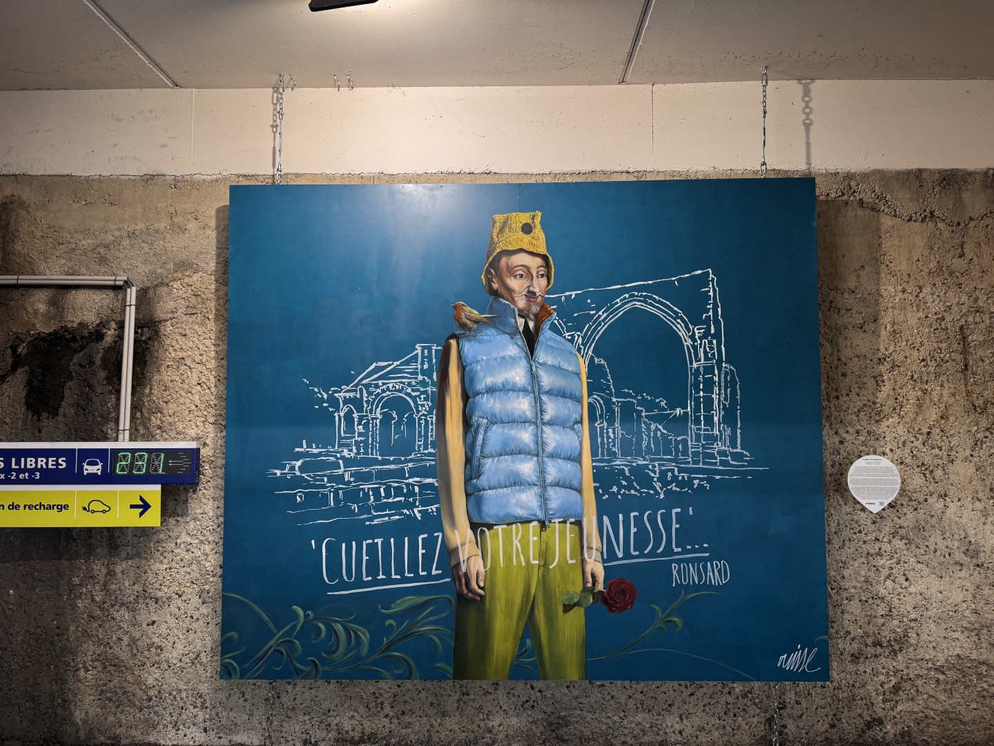 Au sein du parking INDIGO Gare–Palais des Congrès, les artistes dévoilent trois fresques qui illustrent la dimension intemporelle de l’œuvre de ces écrivains, offrant un pont par-delà les âges entre le Tours d’hier, d’aujourd’hui et de demain. Du « Cueillez votre jeunesse » de Ronsard à « Heureux qui, comme Ulysse » de Du Bellay, en passant par le regard balzacien, ces fresques invitent à repenser notre approche de ces géants littéraires en confrontant leur héritage à un regard contemporain.